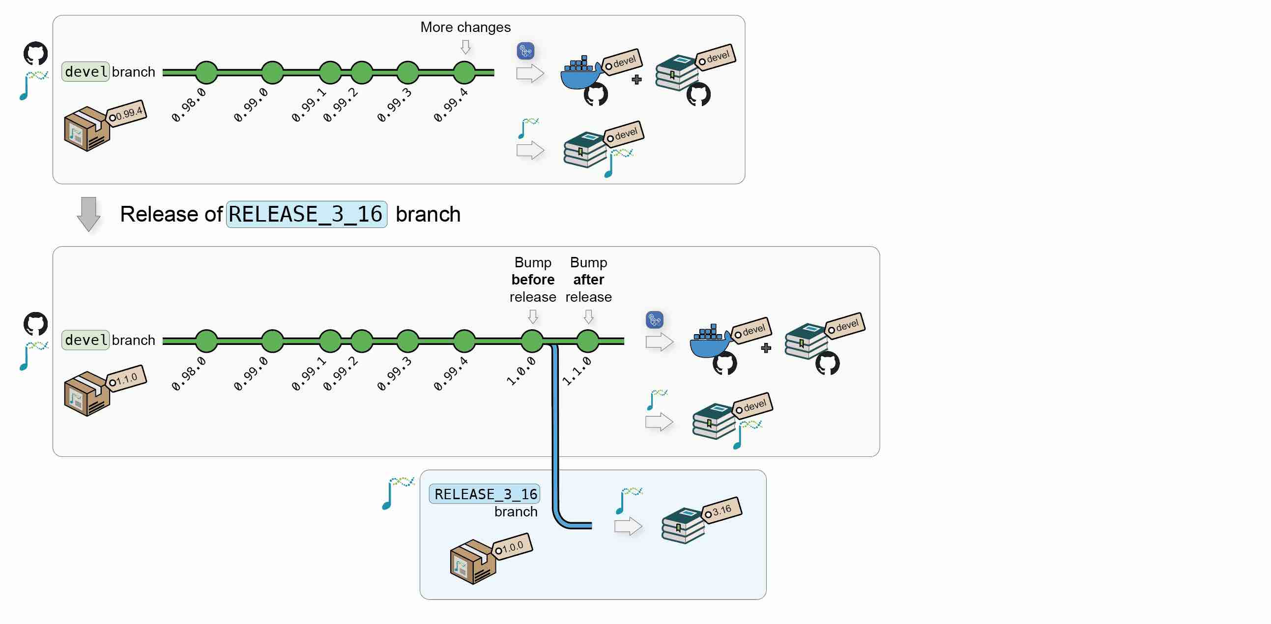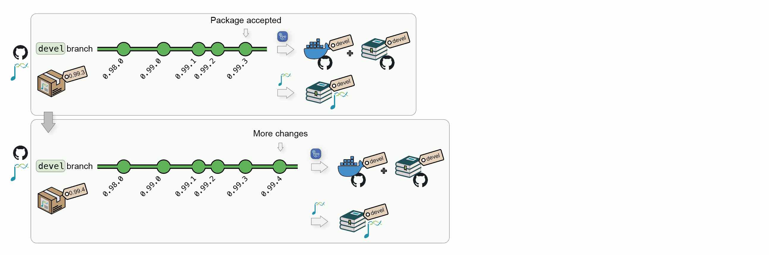 develDocker image and the online bookdevelversion; - Regularly, the author bumps versions and push to Bioconductor’s