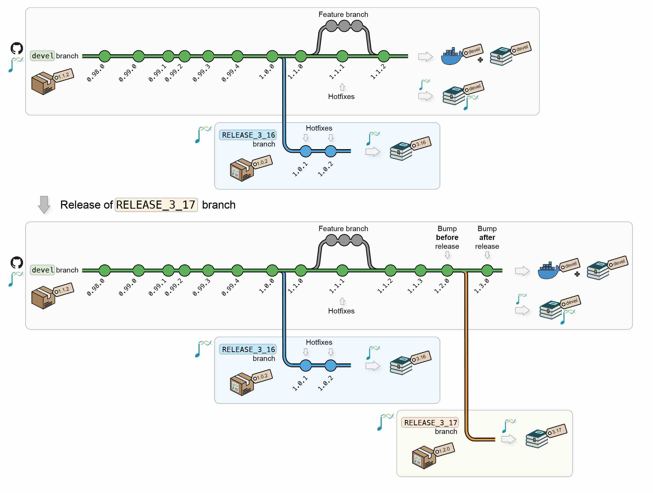 When Bioconductor releases a version X.Y, the core team will automatically create a new upstream:<package_name>@RELEASE_X_Y. This will automatically trigger new builds of the Bioconductor’s hosted book against the new release.