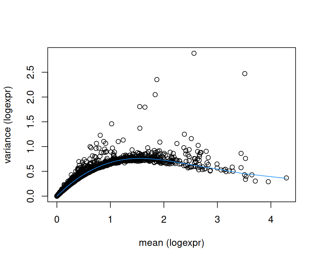 Next, apply methods from scran. This gives a list of top HVGs, which can be used as the input for subsequent steps. The parameter prop defines the proportion of HVGs to select – for example, prop = 0.1 returns the top 10%. (Alternatively, argument n can be used to selected a fixed number of top HVGs, say 1000 or 2000.)
