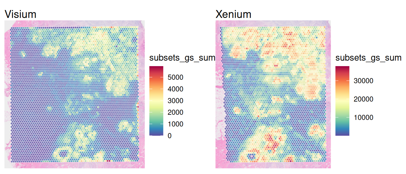 Next, let’s compute some standard quality control metrics on both, the Visium and pseudo-spot Xenium data. Besides dataset-specific metrics, we also specify the subset of genes that are shared between both datasets in order to obtain comparable metrics: