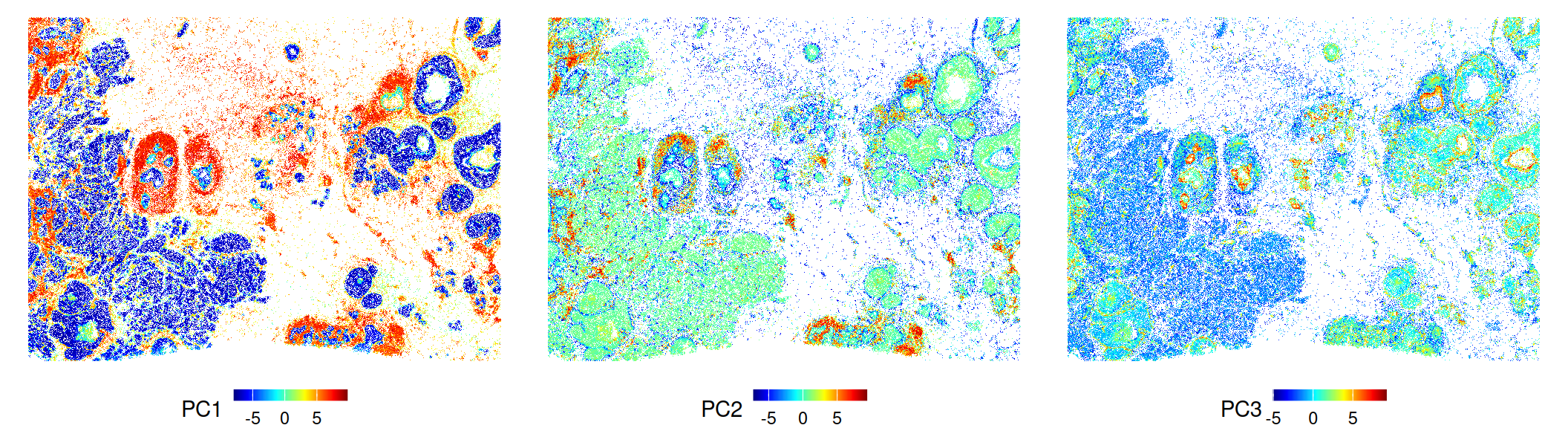 A useful visualization is to color cells by their PCs in physical space. This will help highlight key drivers of transcriptional variability, e.g., between major biological compartments such as epithelia, immune and stromal cells. Exemplary plots of PCs 1-3 are rendered below: