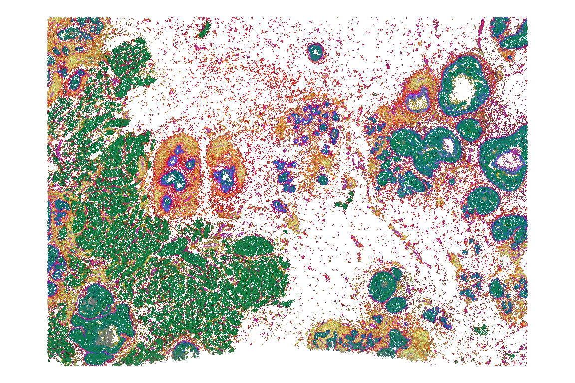 E.g., we see that colors corresponding to opposing PC values are clearly separated in space, indicating distinct drivers of transcriptional variability. In some regions, we see color mixtures, indicating cells of ambiguous transcriptional profiles (with respect to what is being captured by the 3 PCs considered here).
