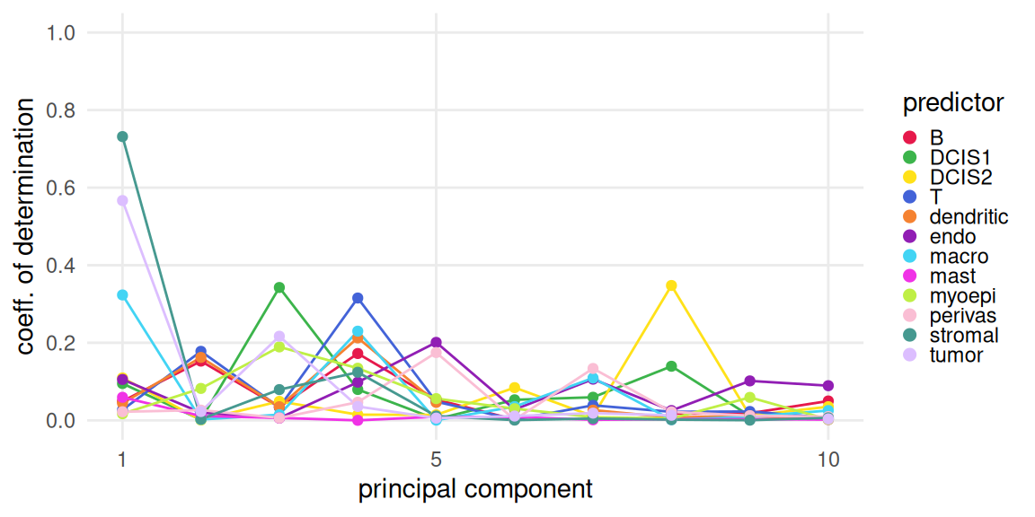 vis <- runPCA(vis, ncomponents=20, subset_row=hvg)We fit the deconvolution result of each cell type against the first 10 PCs to obtain 10 regressions.