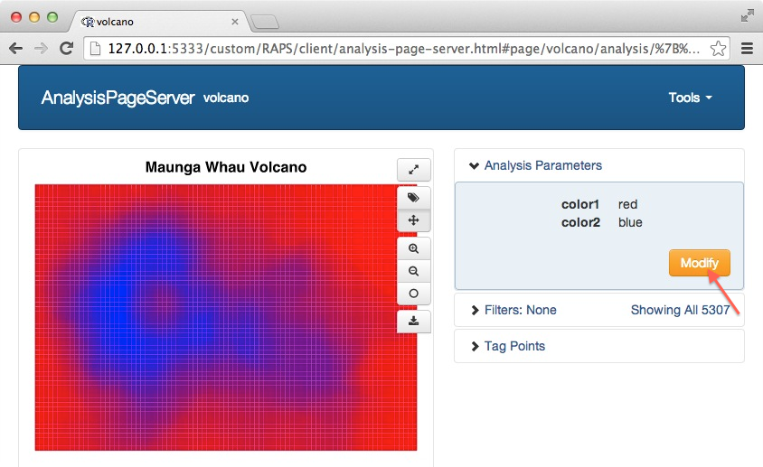 The interactivites discussed on the Interactivity documentation page, including roll-over, filtering, zooming, tagging and download, are all available with this deployment. Since they are described in detail there no more will be said about them here. What's new is the "Analysis Parameters" section, which is a condensed version of the primary parmeter area and lets the user see the inputs to the function. This section can also be used to repeat the analysis with modified parameters. First, click on Modify: