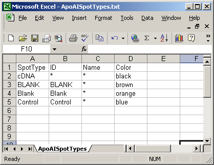 Every Spot Types file must have a SpotType column, for which each entry should be unique. It must also have an ID column, a Name column and a default Color column. The rows of the SpotTypes file should be read as a list of rules (in order) for defining spot types. The first rule usually specifies that every spot is a gene (or cDNA), then subsequent rules reclassify certain spots (controls, blanks etc.) according to what is found in the ID or Name column of the GAL file. Because these rules are applied in order, it is best to begin with spot type rules which describe large numbers of spots, followed by rules describing more and more specific spot types. For example, consider the effect of swapping the order of the two rules “1. Everything is a gene” and “2. Everything with ‘scorecard’ in the ID column is a scorecard spike-in control.”. If the more general rule (the first one) was applied after the more specific rule (the second one), it would overwrite the results of the more specific rule, so for this reason, more general rules should be in the top rows of the SpotTypes table.