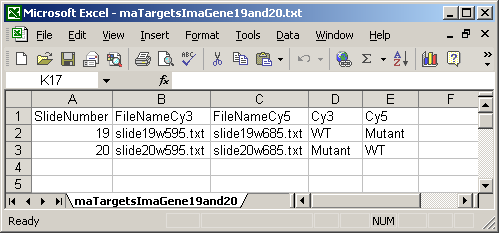 The ImaGene Targets file below shows the special case of the ImaGene image-processing software which gives two (tab-delimited text) output files for each slide, one for the Cy3 (Green) channel and one for the Cy5 (Red) channel. So instead of having a single FileName column, there are two file name columns: a FileNameCy3 column and a FileNameCy5 column.