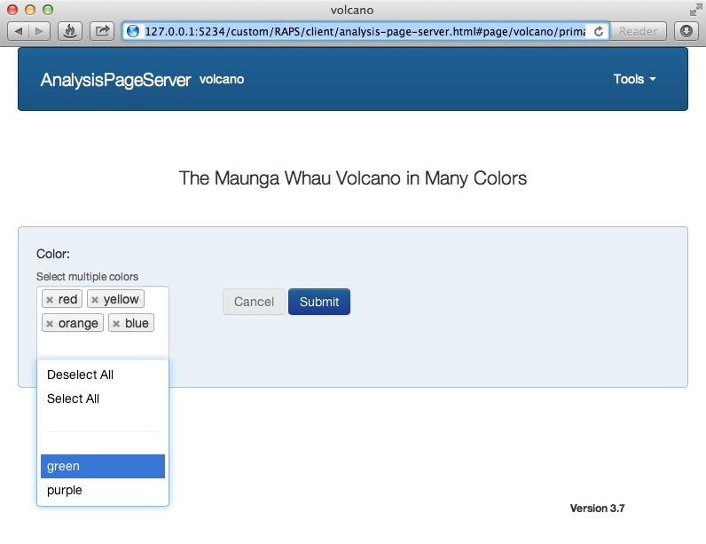 Now we can see the two arguments of the handler function, color1 and color2, have been rendered as HTML text inputs, and prepopulated with their default values. (This is default behavior, but there is a rich syntax to define complex parameters, and this is explored below.) Also note that the URL has updated. This new URL, with the suffix #page/volcano/primary, will automatically jump to the primary parameter area for the volcano page. Clicking on Submit takes us to the analysis result: