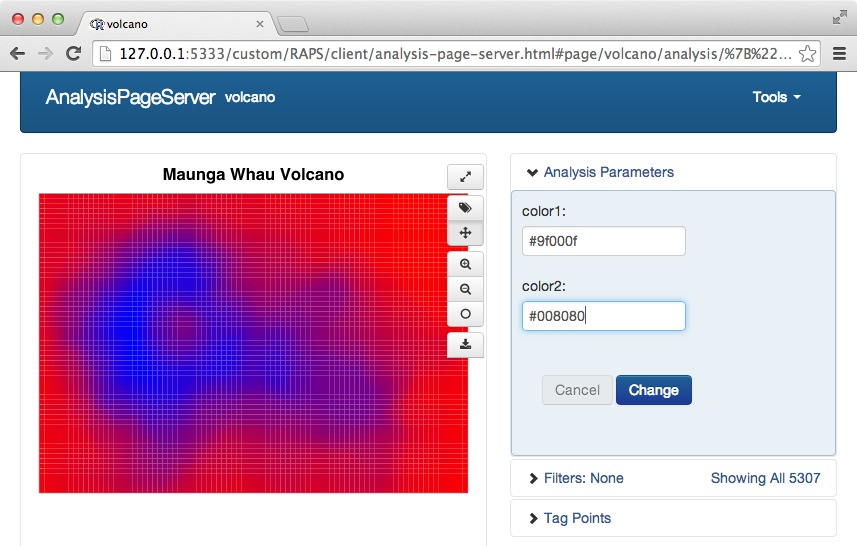 The interactivites discussed on the Interactivity documentation page, including roll-over, filtering, zooming, tagging and download, are all available with this deployment. Since they are described in detail there no more will be said about them here. What's new is the "Analysis Parameters" section, which is a condensed version of the primary parmeter area and lets the user see the inputs to the function. This section can also be used to repeat the analysis with modified parameters. First, click on Modify: