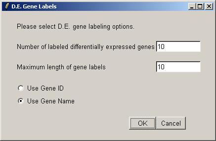 Again, choose the "Swirl vs Wild Type" parameterization, and the "(swirl)-(wild type)" parameter. limmaGUI allows you to add gene labels to the plot for genes with the most evidence of differential expression. Enter the number of gene labels you would like.