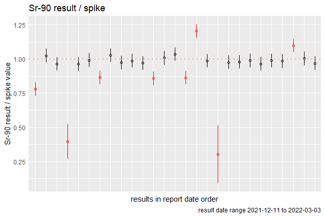 plot_run provides run charts with the option of plotting in analysis units or by a ratio of the laboratory results to the blind spike values. Both versions show uncertainty ranges of the results. Uncertainty bars are shown on the laboratory results and the ratios. When there is no overlap with the spike values, the laboratory result is either a false positive or a false negative. False positives are excluded from the ratio version when there is no spike value to avoid division by zero.