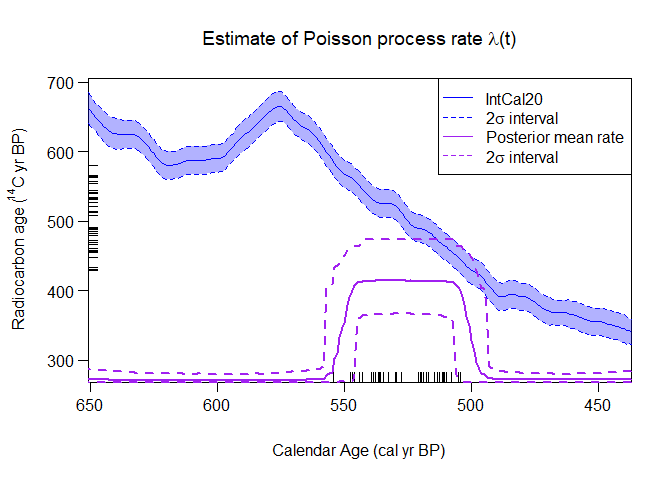 calibration_curve=intcal20)Once the calibration has been run, the posterior estimate for the occurrence rate of the samples can be plotted.