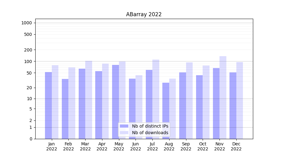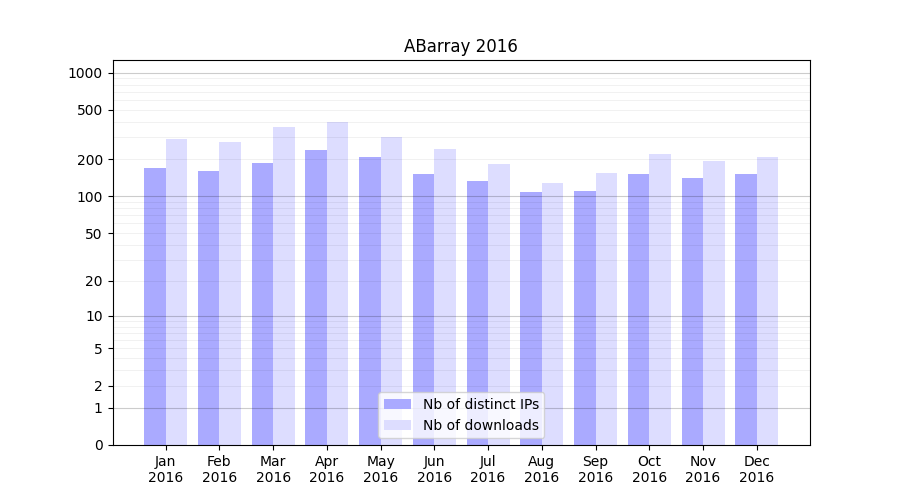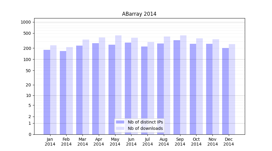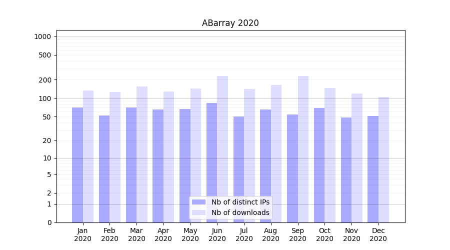Number of downloads for software package ABarray, year by year, from 2025 back to 2014 (years with no downloads are omitted):