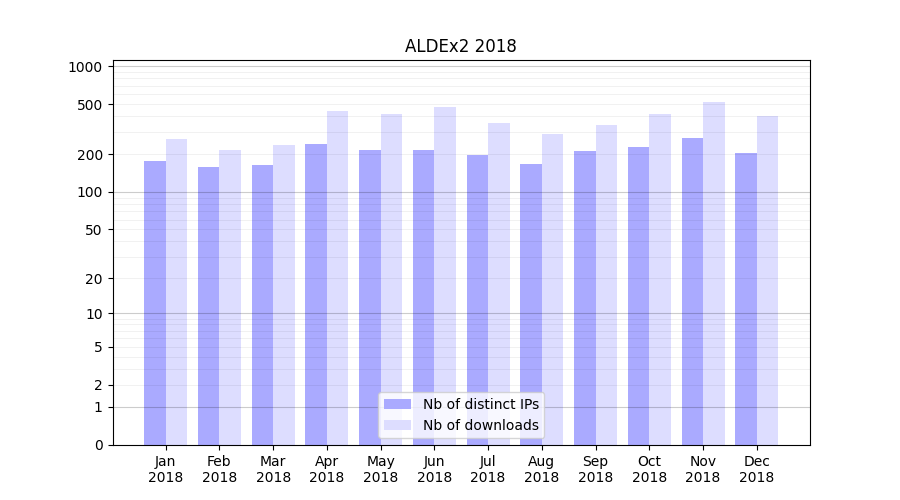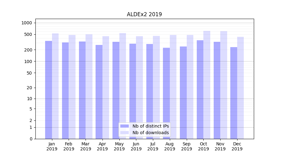 Number of downloads for software package ALDEx2, year by year, from 2025 back to 2014 (years with no downloads are omitted):