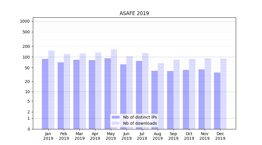 Number of downloads for software package ASAFE, year by year, from 2025 back to 2014 (years with no downloads are omitted):