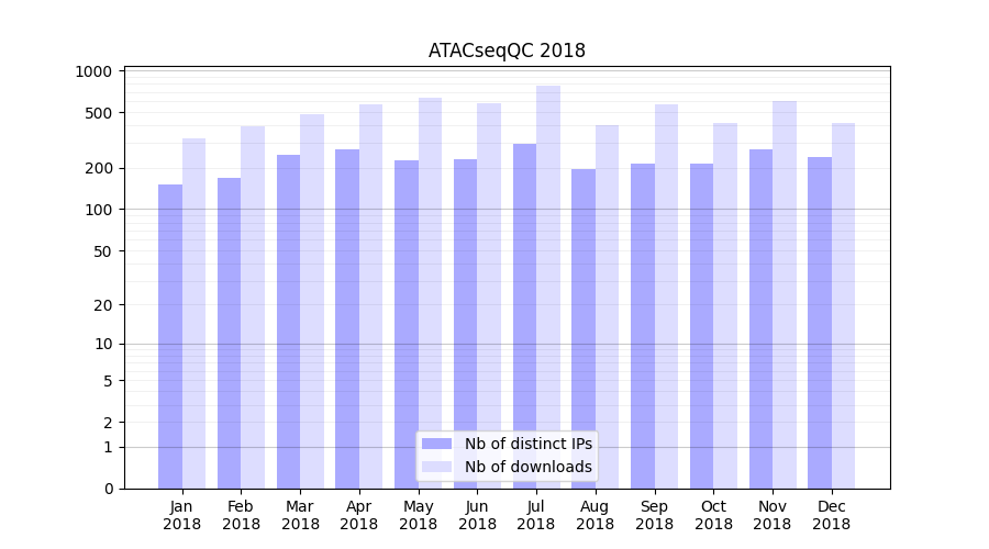 Number of downloads for software package ATACseqQC, year by year, from 2025 back to 2014 (years with no downloads are omitted):
