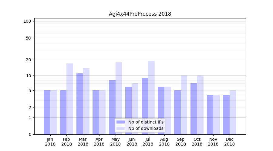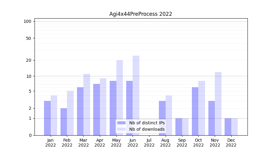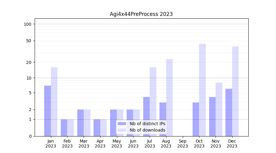 Number of downloads for software package Agi4x44PreProcess, year by year, from 2025 back to 2014 (years with no downloads are omitted):