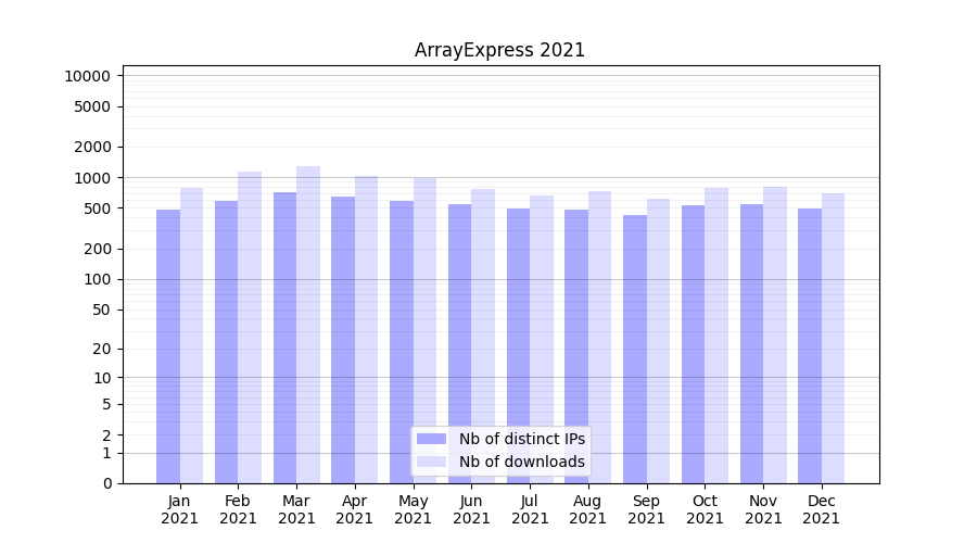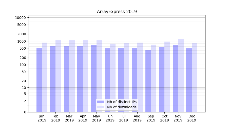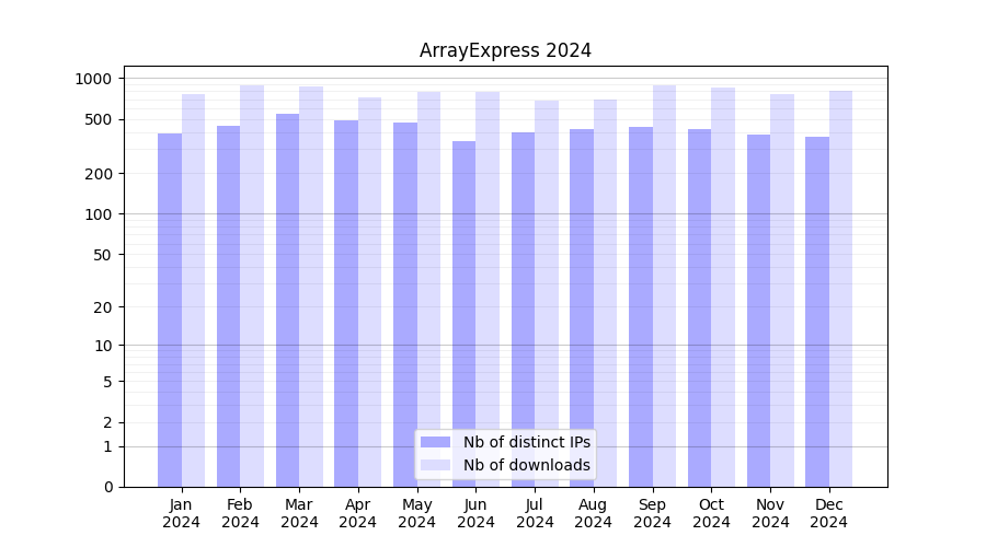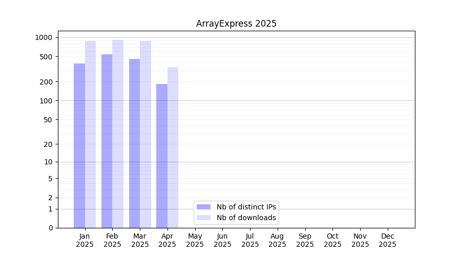 Number of downloads for software package ArrayExpress, year by year, from 2025 back to 2014 (years with no downloads are omitted):