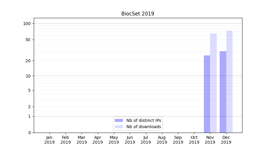 Number of downloads for software package BiocSet, year by year, from 2025 back to 2014 (years with no downloads are omitted):