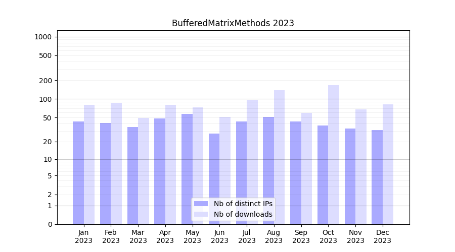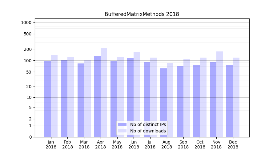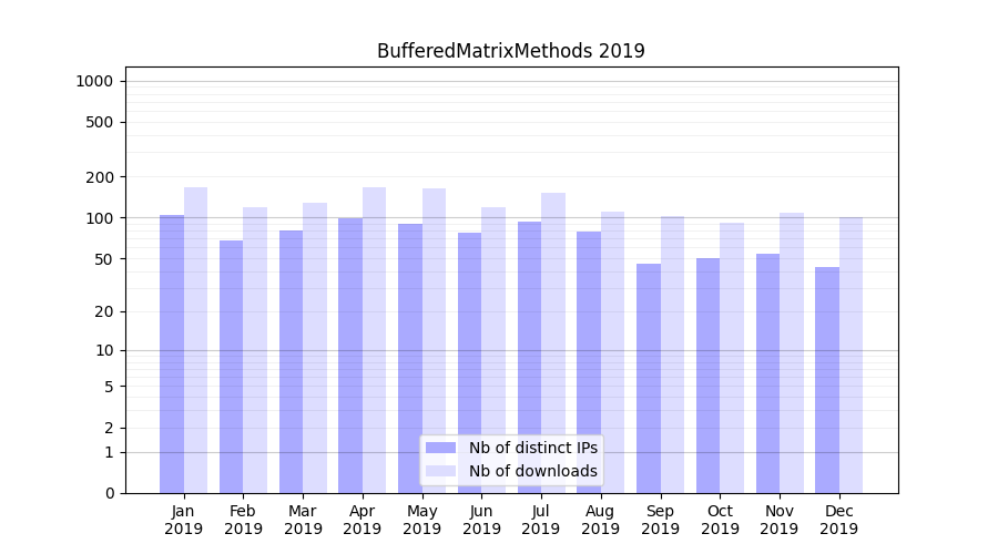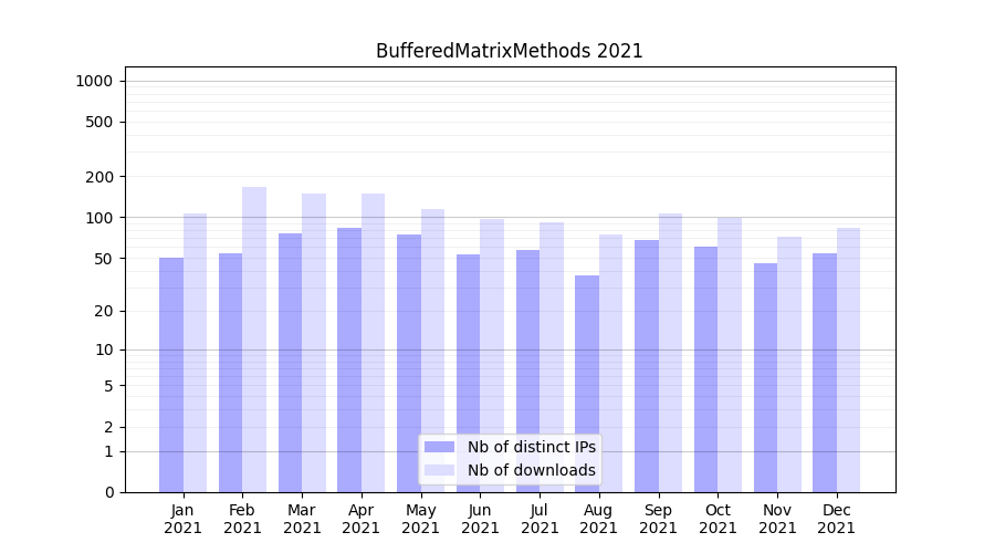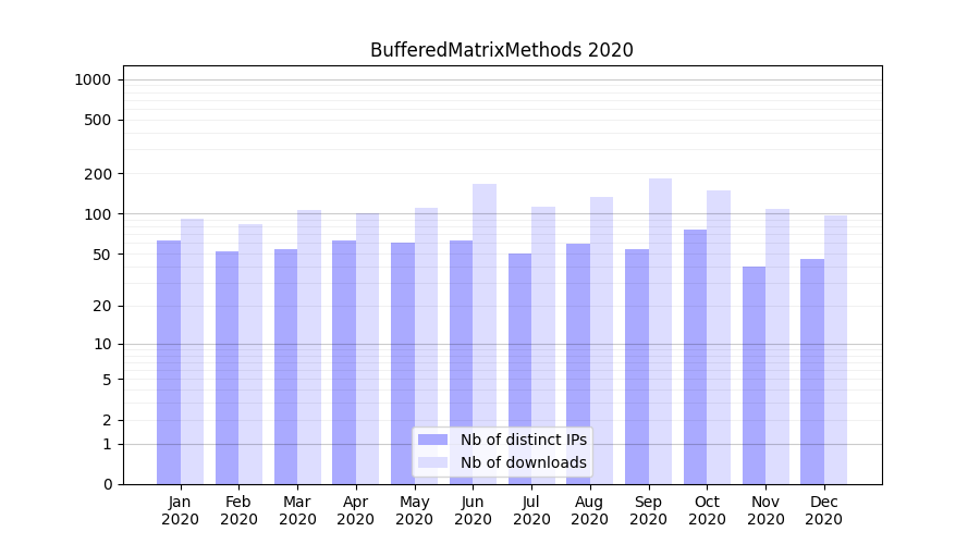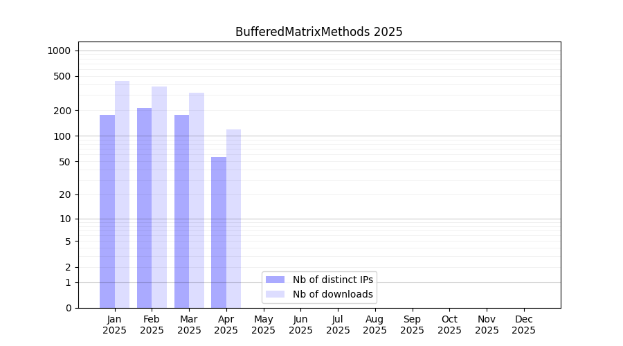 Number of downloads for software package BufferedMatrixMethods, year by year, from 2025 back to 2014 (years with no downloads are omitted):