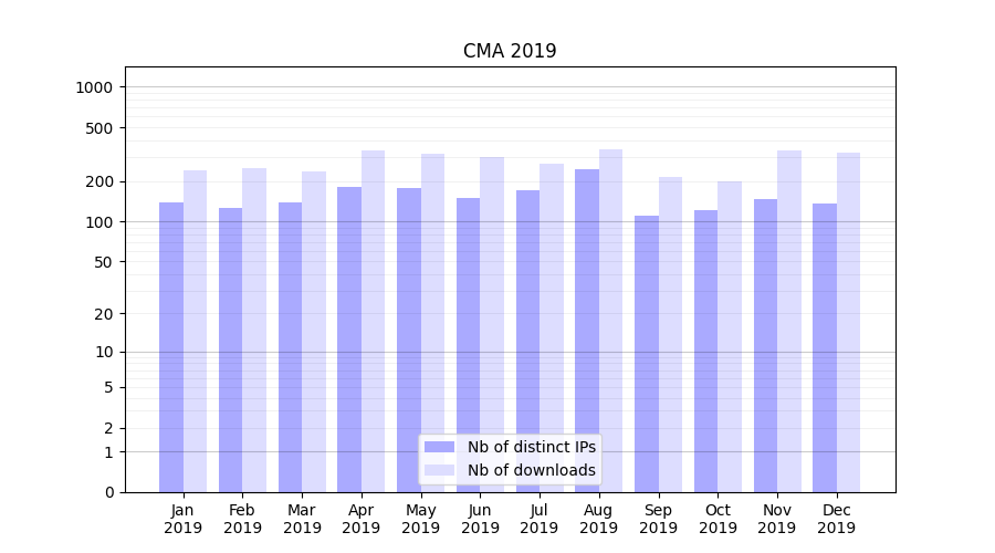 Number of downloads for software package CMA, year by year, from 2025 back to 2014 (years with no downloads are omitted):