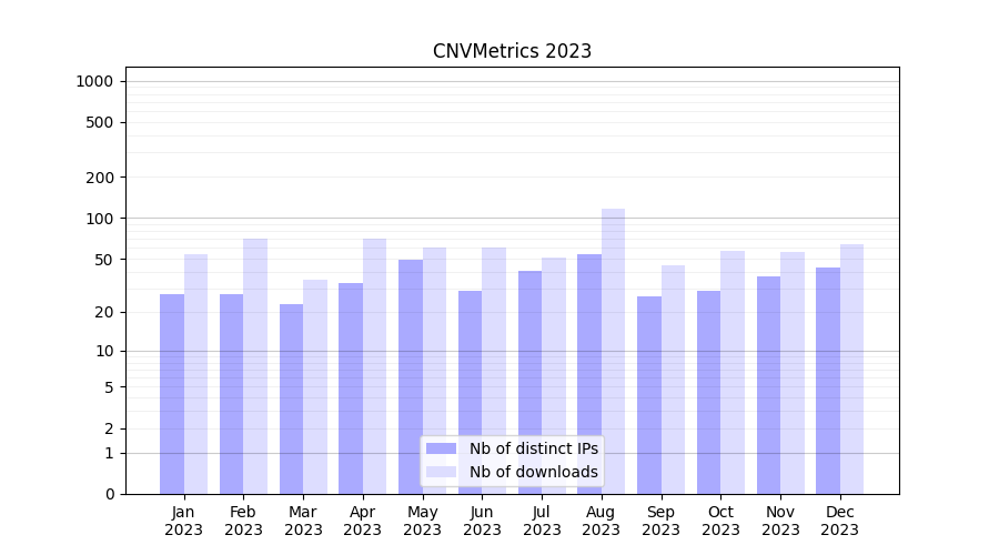 Number of downloads for software package CNVMetrics, year by year, from 2025 back to 2014 (years with no downloads are omitted):