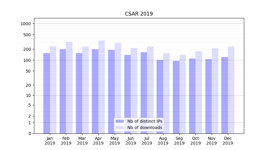 Number of downloads for software package CSAR, year by year, from 2025 back to 2014 (years with no downloads are omitted):