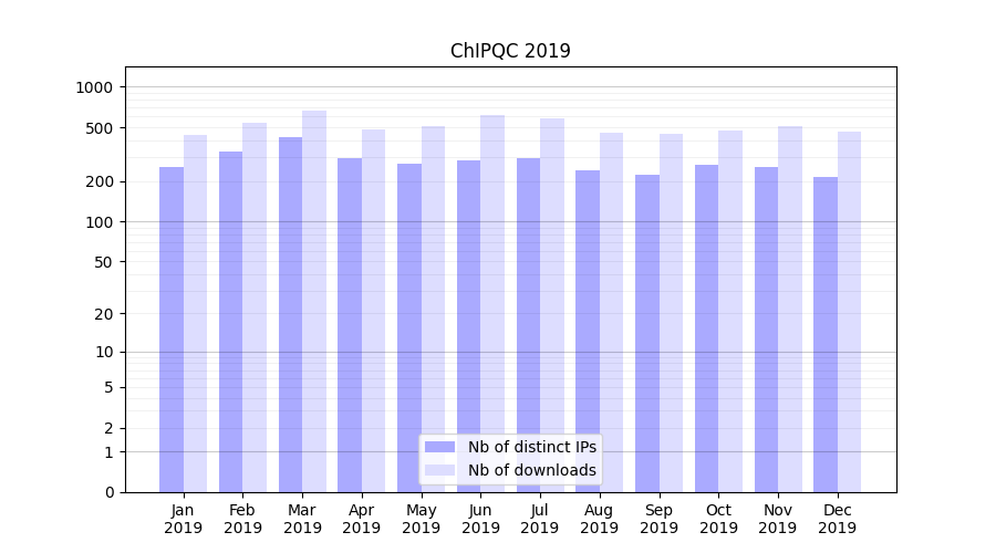 Number of downloads for software package ChIPQC, year by year, from 2025 back to 2014 (years with no downloads are omitted):