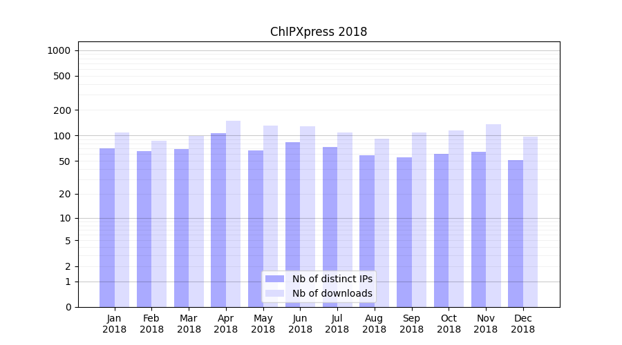 Number of downloads for software package ChIPXpress, year by year, from 2025 back to 2014 (years with no downloads are omitted):