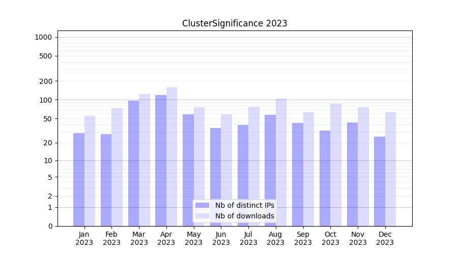 Number of downloads for software package ClusterSignificance, year by year, from 2025 back to 2014 (years with no downloads are omitted):