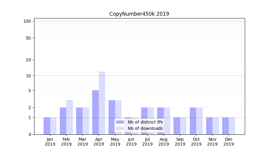 Number of downloads for software package CopyNumber450k, year by year, from 2025 back to 2014 (years with no downloads are omitted):