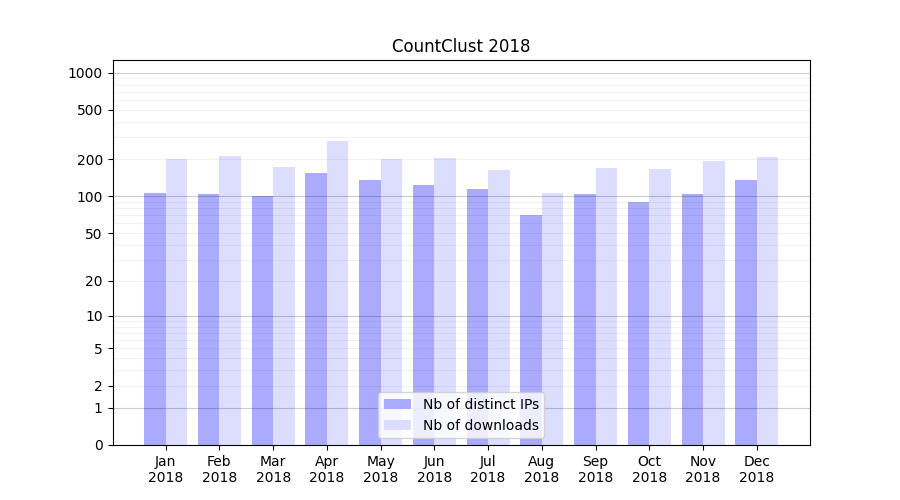 Number of downloads for software package CountClust, year by year, from 2025 back to 2014 (years with no downloads are omitted):
