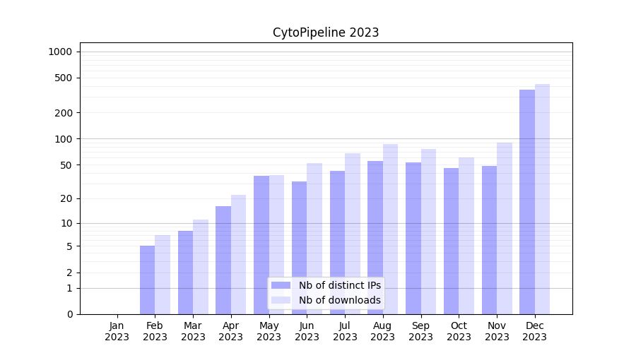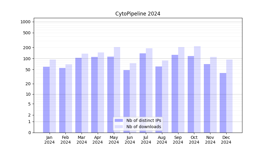 Number of downloads for software package CytoPipeline, year by year, from 2025 back to 2014 (years with no downloads are omitted):