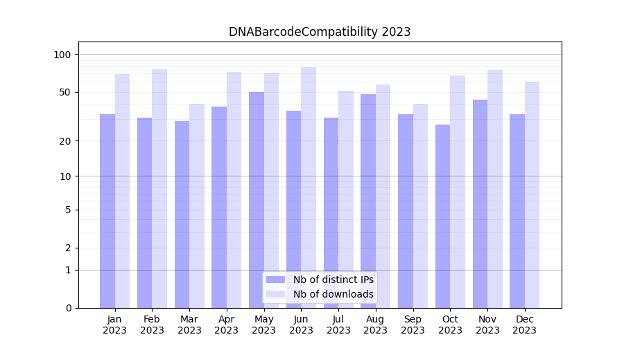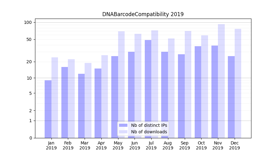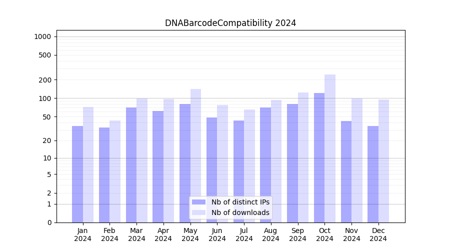 Number of downloads for software package DNABarcodeCompatibility, year by year, from 2025 back to 2014 (years with no downloads are omitted):