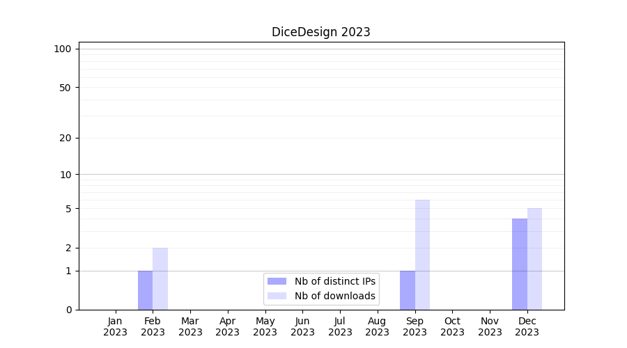 Number of downloads for software package DiceDesign, year by year, from 2025 back to 2014 (years with no downloads are omitted):