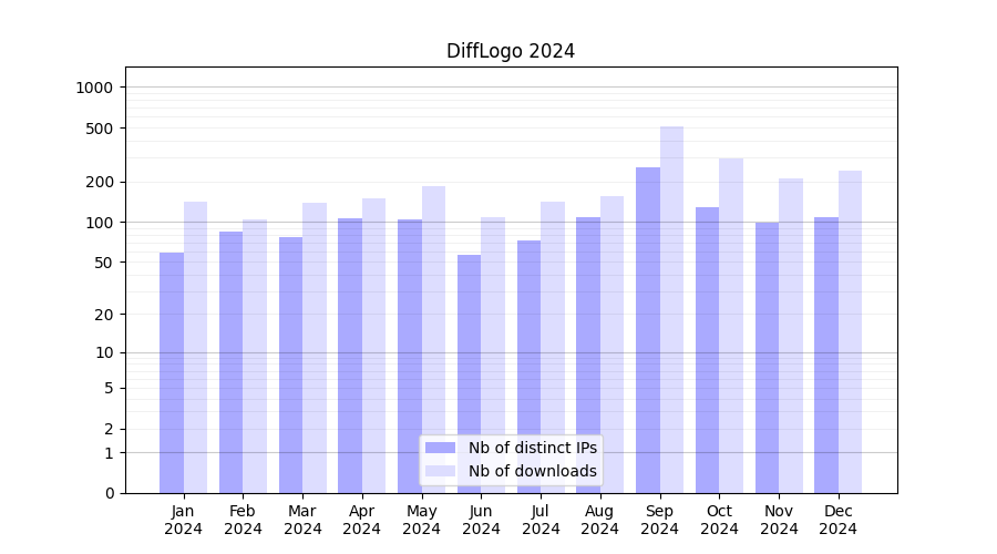 Number of downloads for software package DiffLogo, year by year, from 2025 back to 2014 (years with no downloads are omitted):