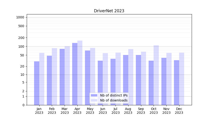 Number of downloads for software package DriverNet, year by year, from 2025 back to 2014 (years with no downloads are omitted):