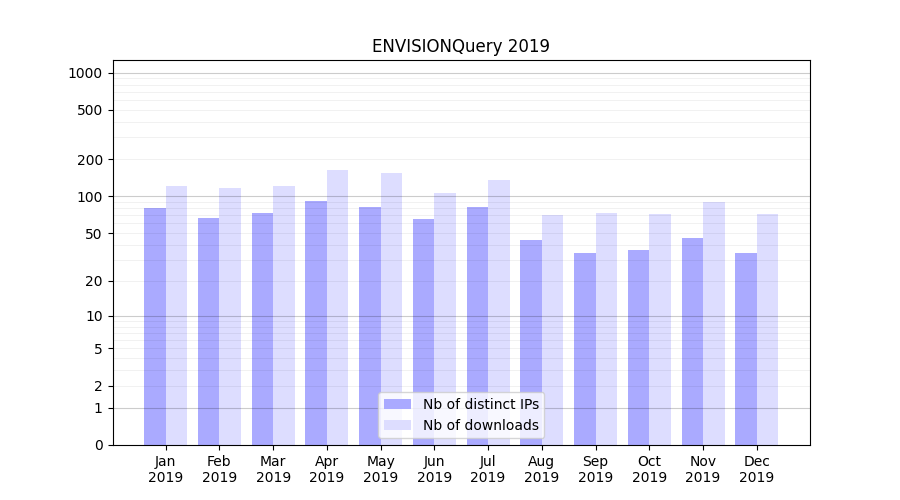 Number of downloads for software package ENVISIONQuery, year by year, from 2025 back to 2014 (years with no downloads are omitted):
