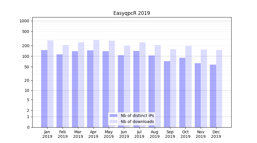 Number of downloads for software package EasyqpcR, year by year, from 2025 back to 2014 (years with no downloads are omitted):