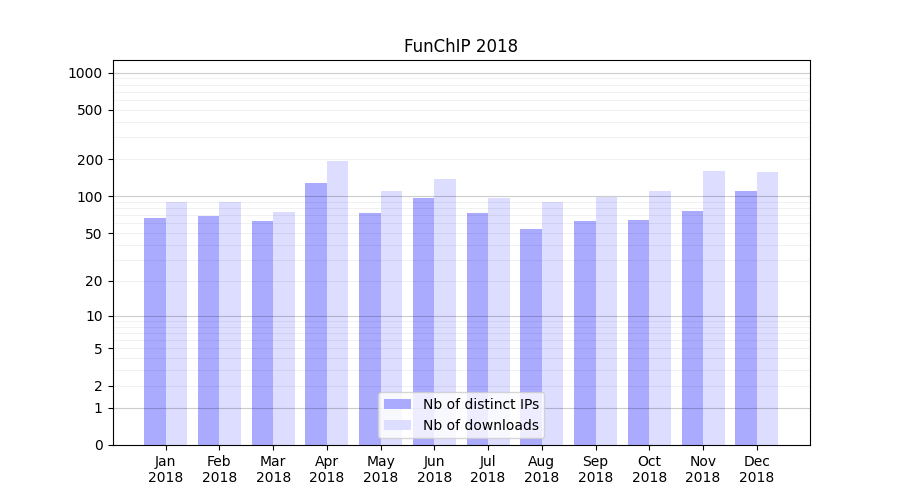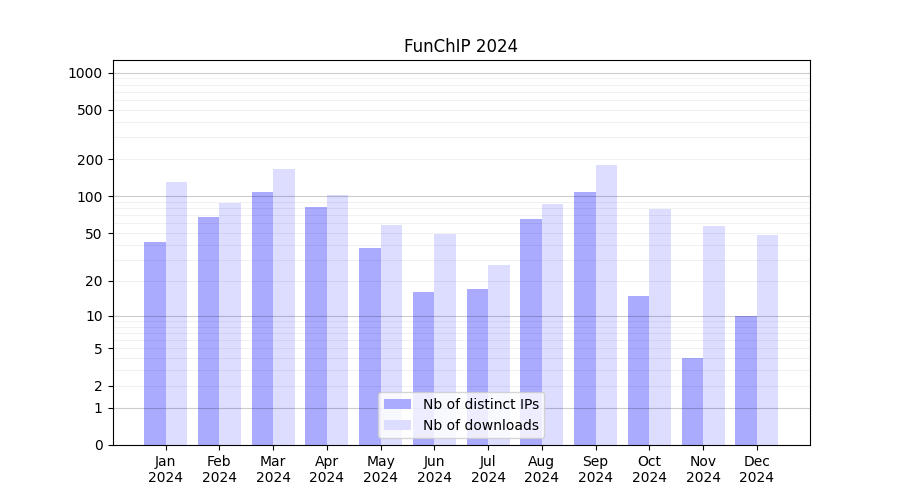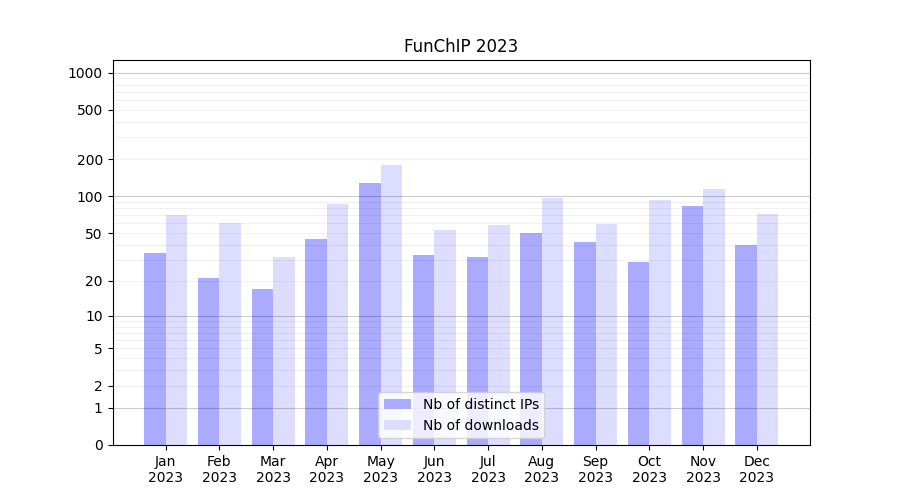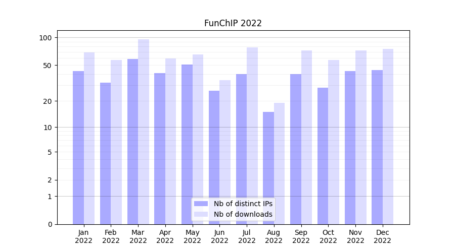 Number of downloads for software package FunChIP, year by year, from 2025 back to 2014 (years with no downloads are omitted):