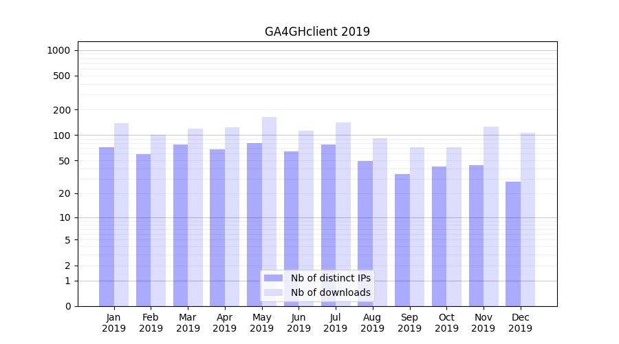 Number of downloads for software package GA4GHclient, year by year, from 2025 back to 2014 (years with no downloads are omitted):