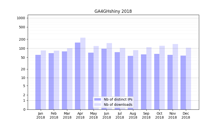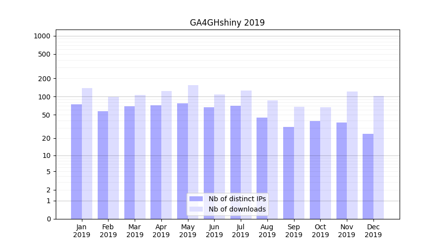 Number of downloads for software package GA4GHshiny, year by year, from 2025 back to 2014 (years with no downloads are omitted):