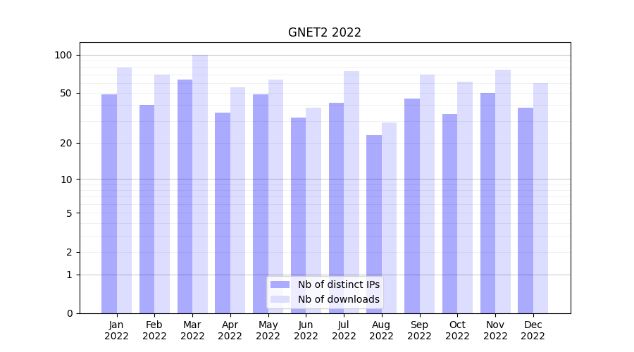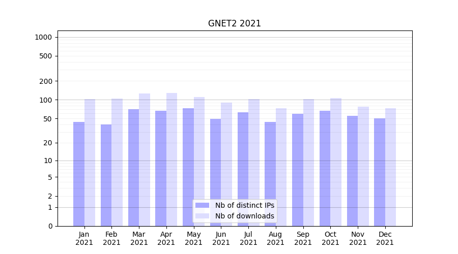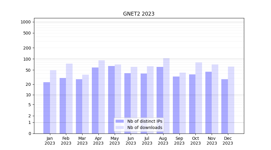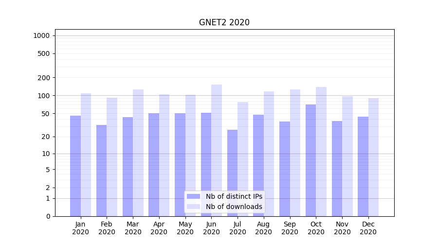 Number of downloads for software package GNET2, year by year, from 2025 back to 2014 (years with no downloads are omitted):