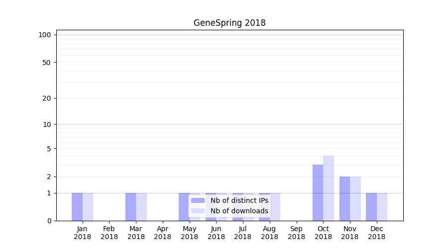 Number of downloads for software package GeneSpring, year by year, from 2025 back to 2014 (years with no downloads are omitted):