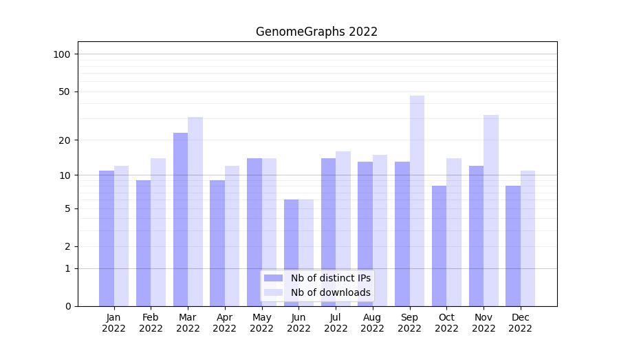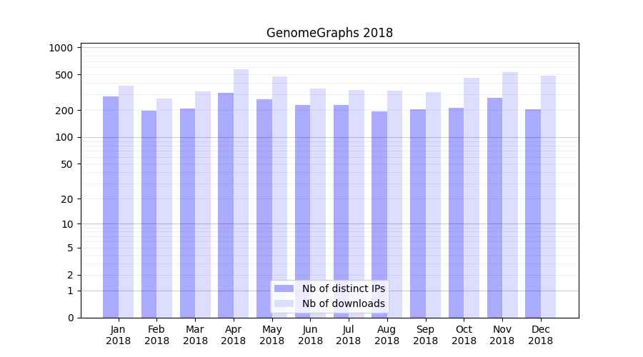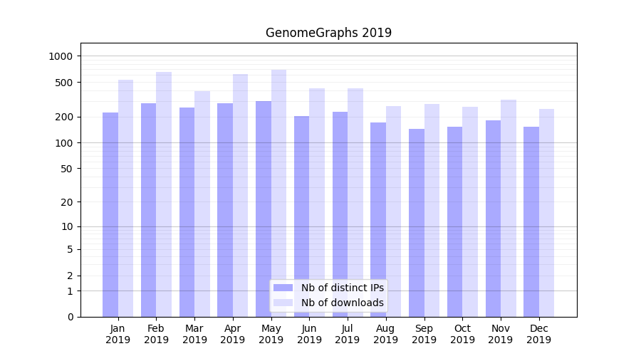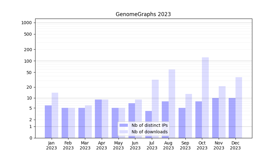 Number of downloads for software package GenomeGraphs, year by year, from 2025 back to 2014 (years with no downloads are omitted):