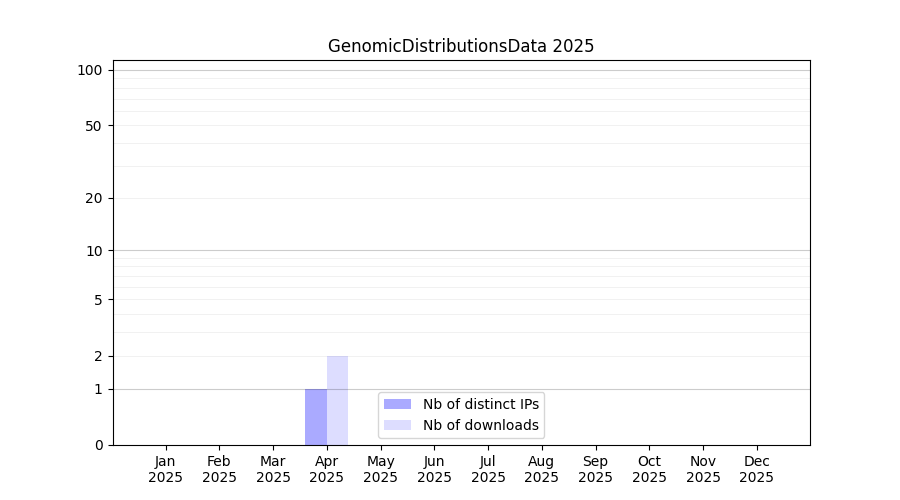 Number of downloads for software package GenomicDistributionsData, year by year, from 2025 back to 2014 (years with no downloads are omitted):