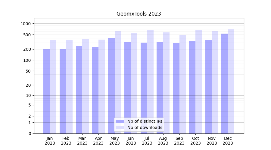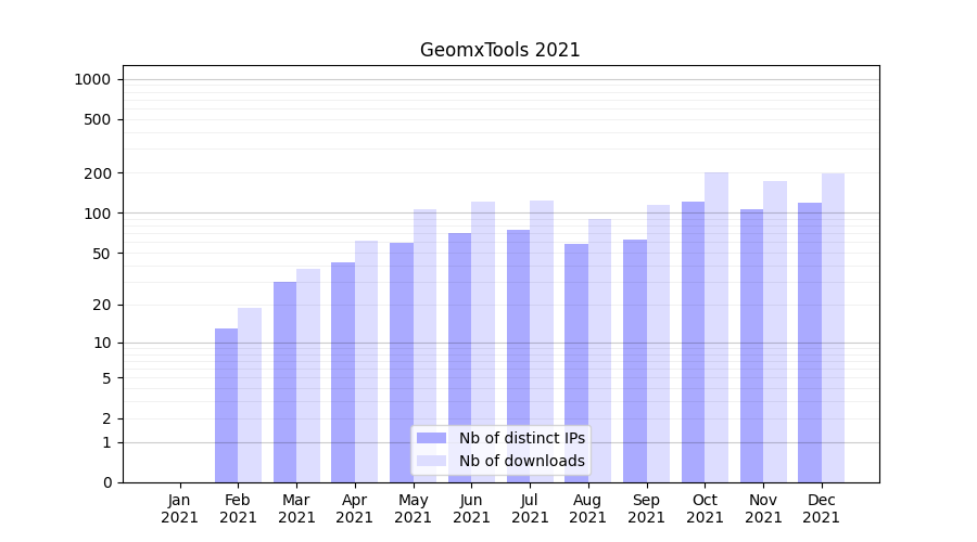 Number of downloads for software package GeomxTools, year by year, from 2025 back to 2014 (years with no downloads are omitted):