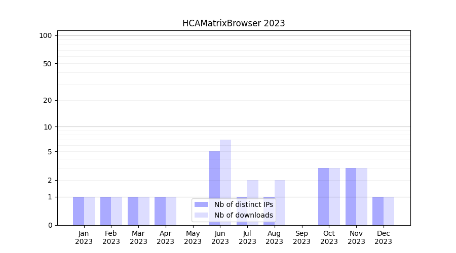 Number of downloads for software package HCAMatrixBrowser, year by year, from 2025 back to 2014 (years with no downloads are omitted):