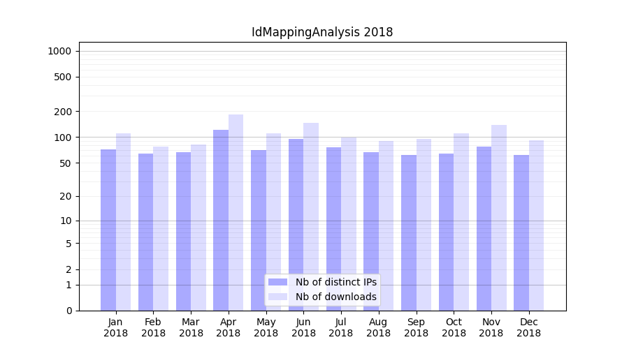 Number of downloads for software package IdMappingAnalysis, year by year, from 2025 back to 2014 (years with no downloads are omitted):