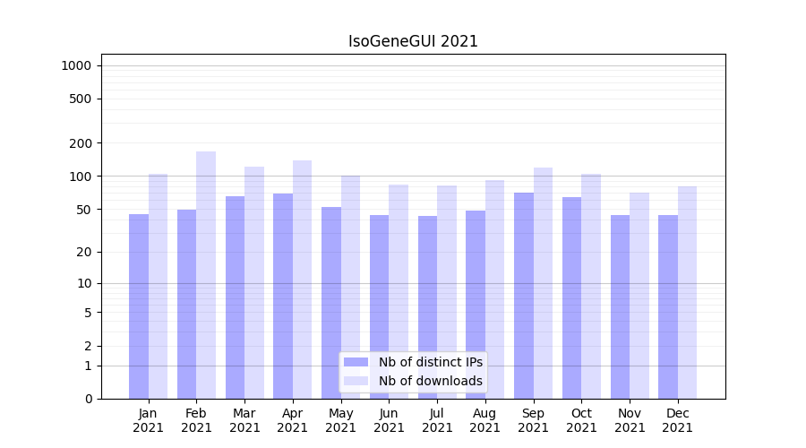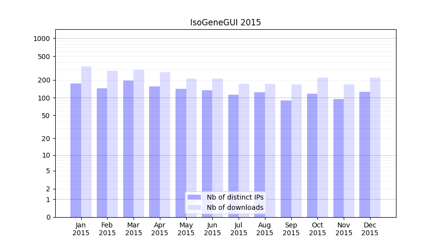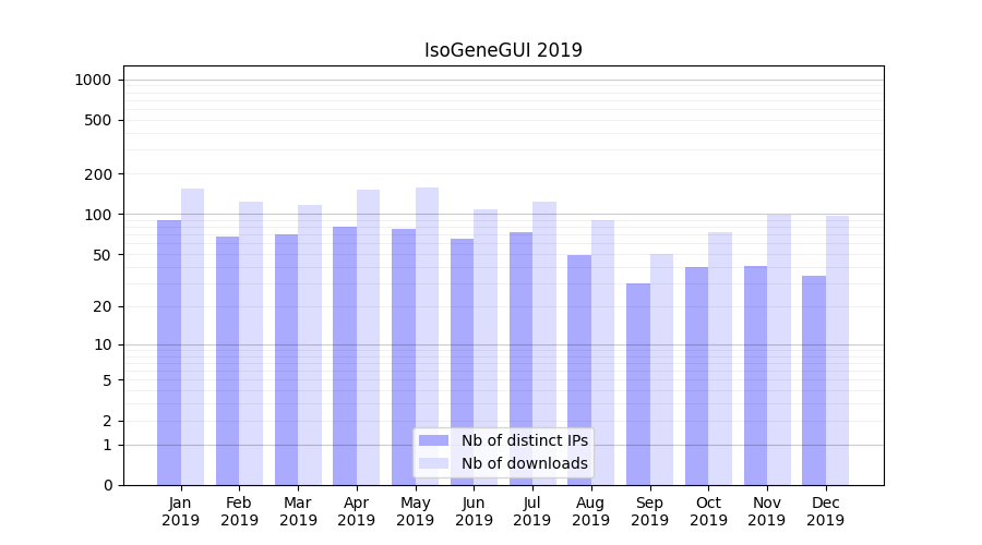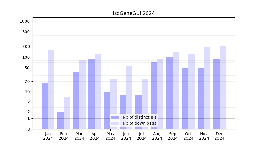 Number of downloads for software package IsoGeneGUI, year by year, from 2025 back to 2014 (years with no downloads are omitted):