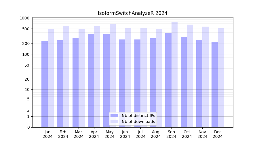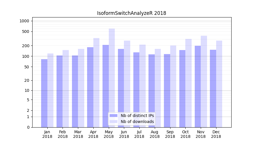 Number of downloads for software package IsoformSwitchAnalyzeR, year by year, from 2025 back to 2014 (years with no downloads are omitted):